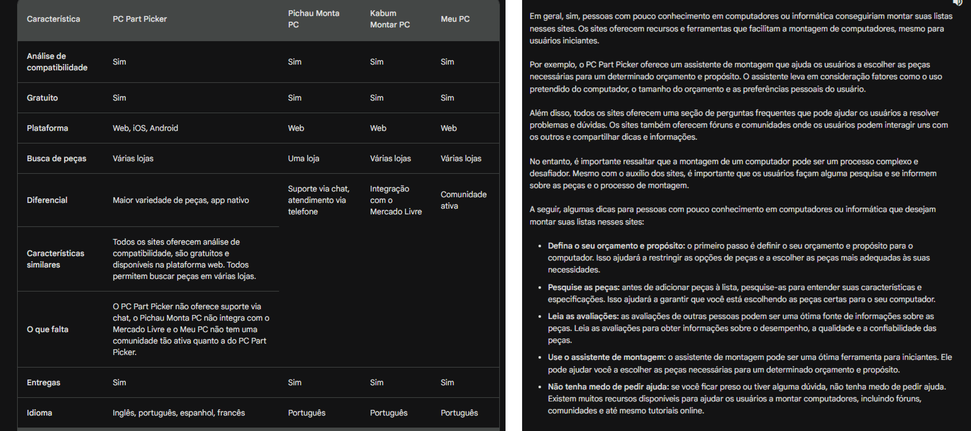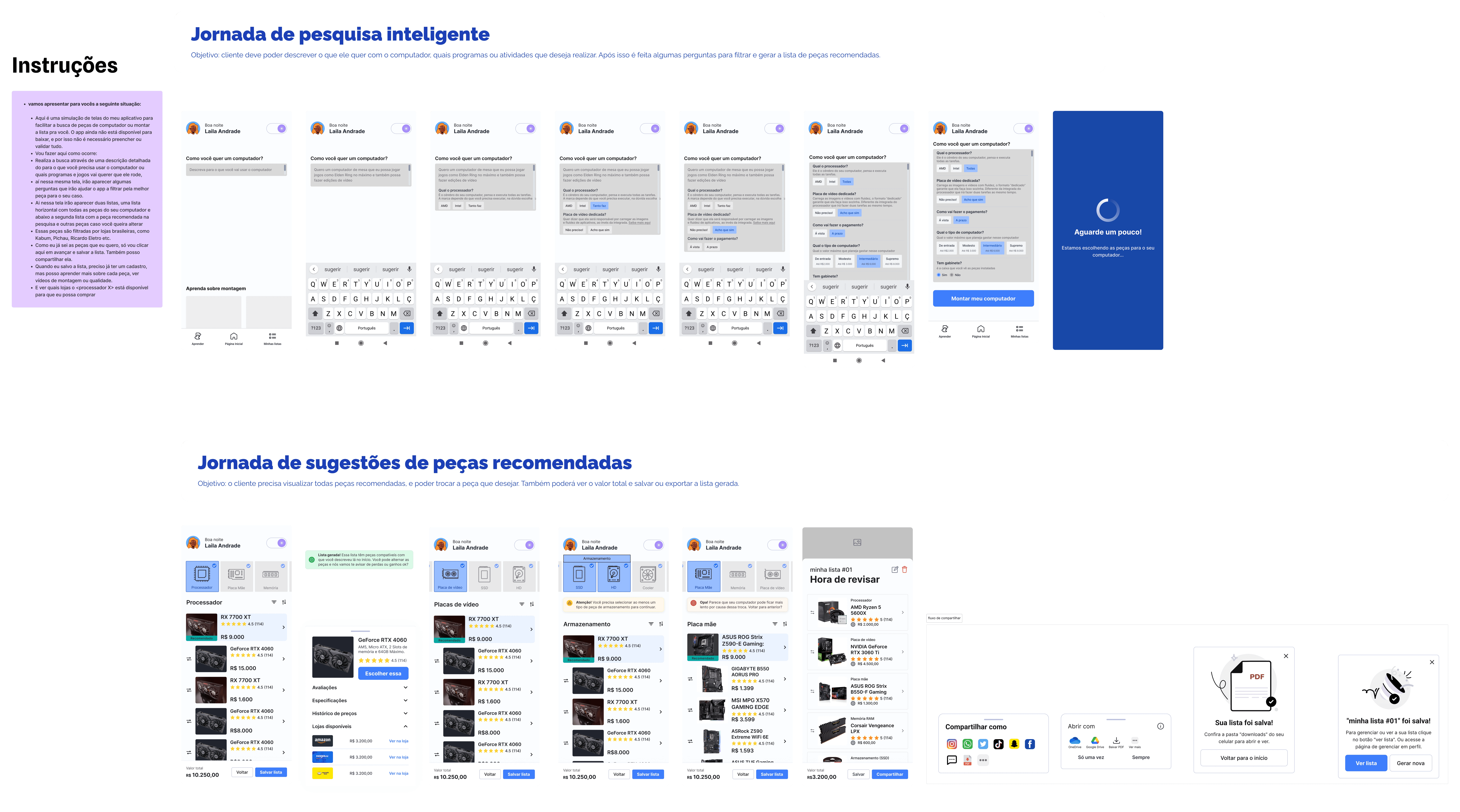 Dado o tempo limitado para conduzir pesquisas extensas, defini uma jornada completa de descrição, escolha e montagem de uma lista de peças para computador, que serviu como espinha dorsal dos testes do projeto. A partir dessa jornada, estruturei três frentes principais de validação: teste sujo, teste de usabilidade e sessões de design critique.