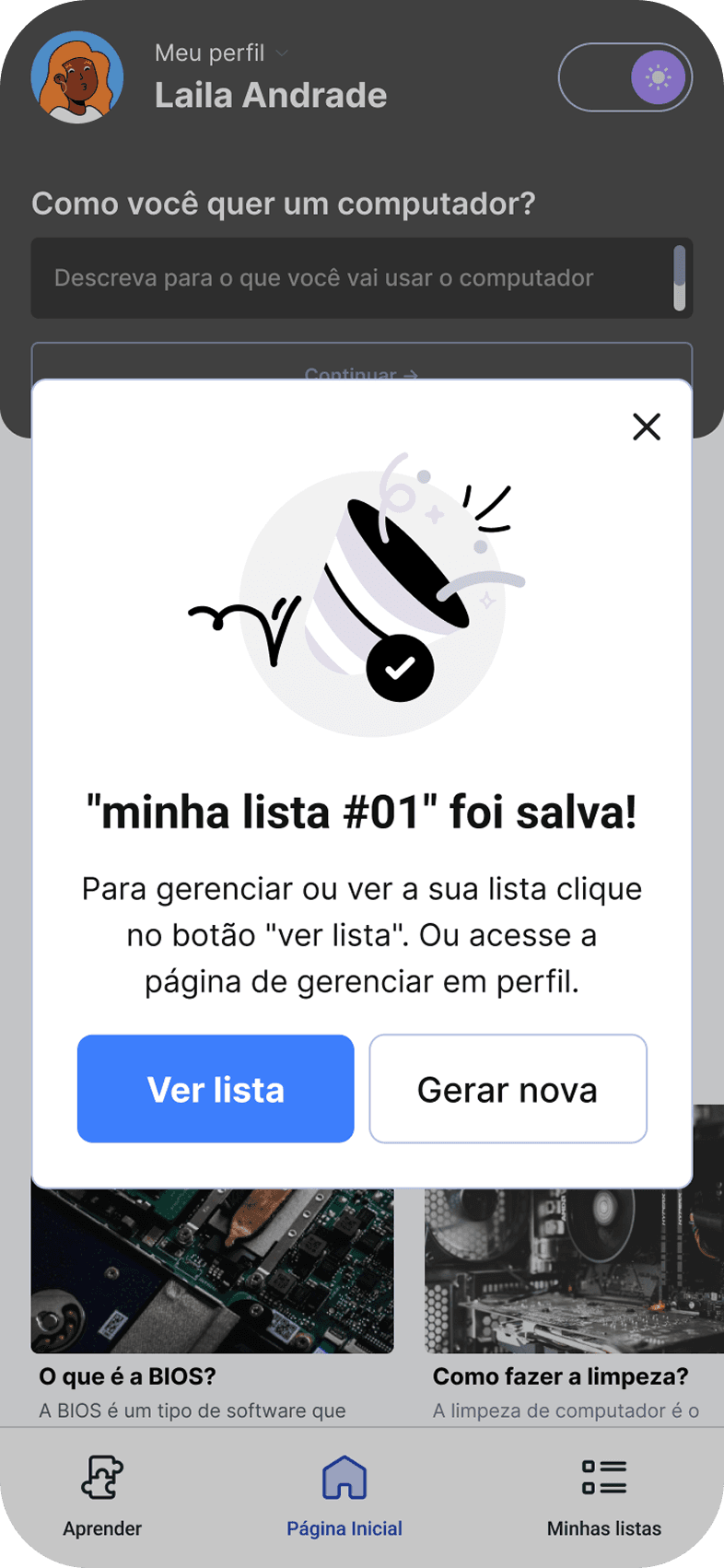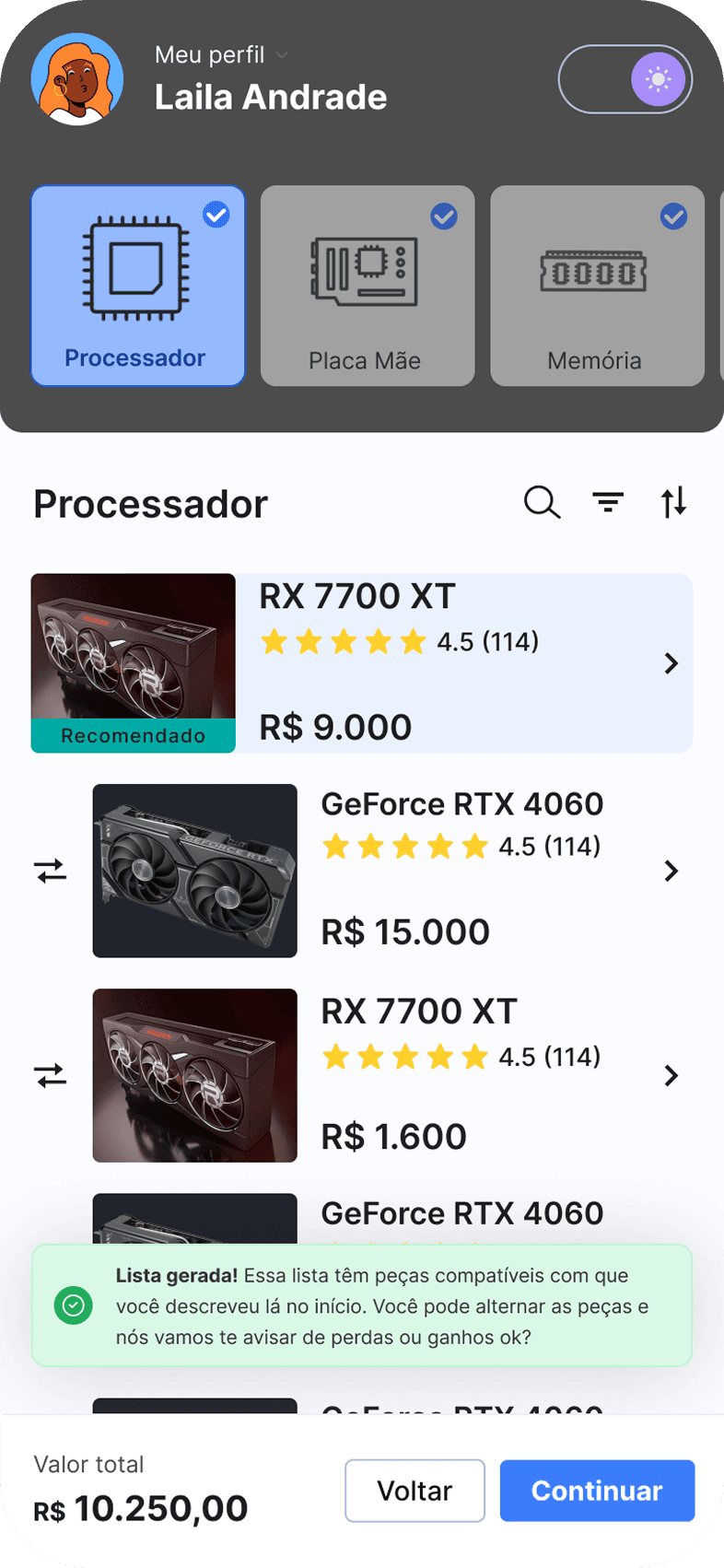 Implementei um modelo de Arquétipos de Uso como ponto de partida da experiência. Ao cruzar perfis (Gamer, Criador, Uso Diário) com faixas de orçamento realistas, criei um sistema de sugestões coerentes que prioriza o custo-benefício. O resultado é uma jornada de compra que entrega o máximo de performance dentro da realidade financeira de cada usuário.